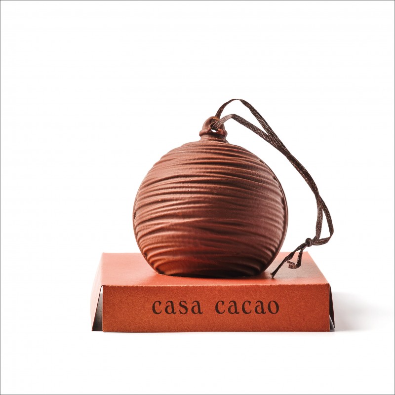 Christmas sphere made with dark chocolate and hazelnut gianduja. Handcrafted in our Bean to Bar workshop.