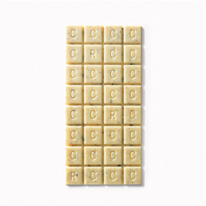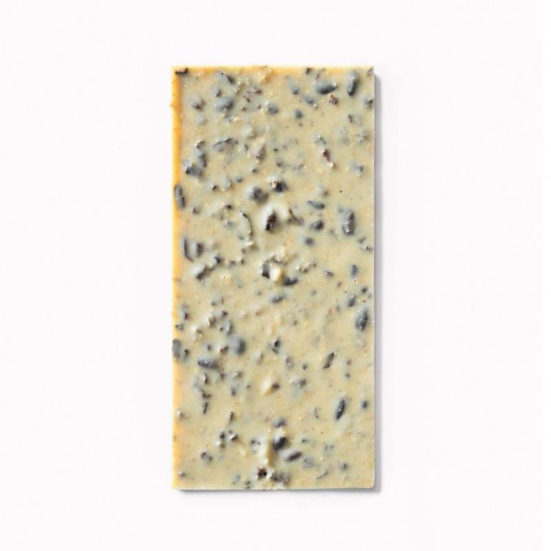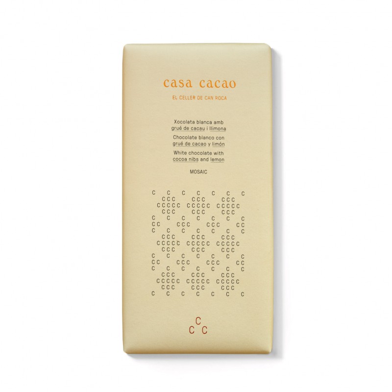 White chocolate (sugar, cocoa butter, skimmed milk powder, concentrated butter (99.8% fat), emulsifier: sunflower lecithin, acidulant: E-330), chopped cacao bean from Ecuador, Hacienda Victoria (10%), lemon peel (3%).