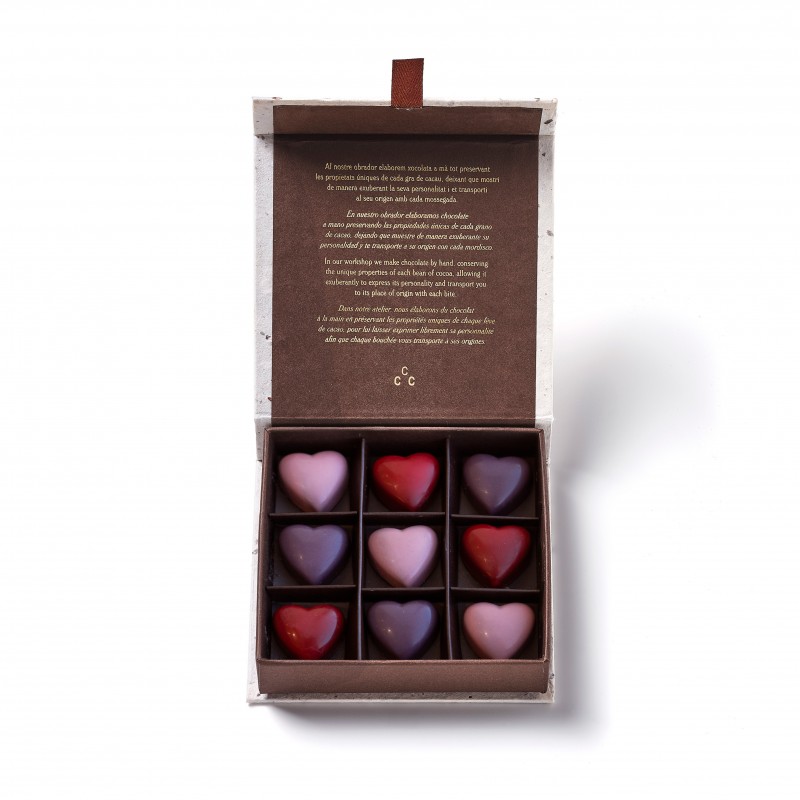 Hemos elaborado una colección especial de bombones para celebrar San Valentín. Un surtido con tres variedades: bombón de fresa y cava, bombón de fruta de la pasión y frambuesa, y bombón de rosa y pistacho.