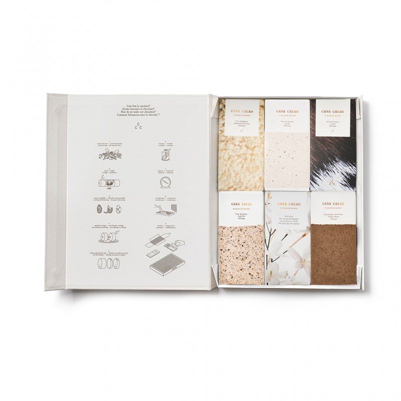 Colección de Casa Cacao que incluye 12 tabletas de chocolate de 80g (7 de chocolate negro, 3 de chocolate con leche y 2 de chocolate con sabores) de los siguientes orígenes: