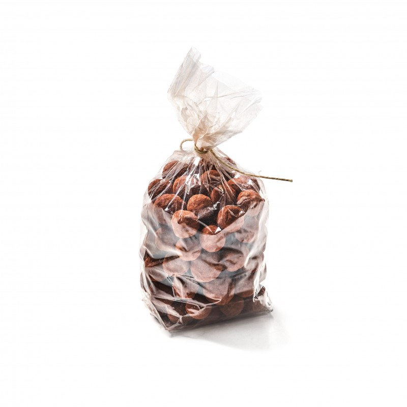 Petite maison de Noël à suspendre, garnie de carambinas au café. Élaborée artisanalement dans notre atelier Bean to Bar.